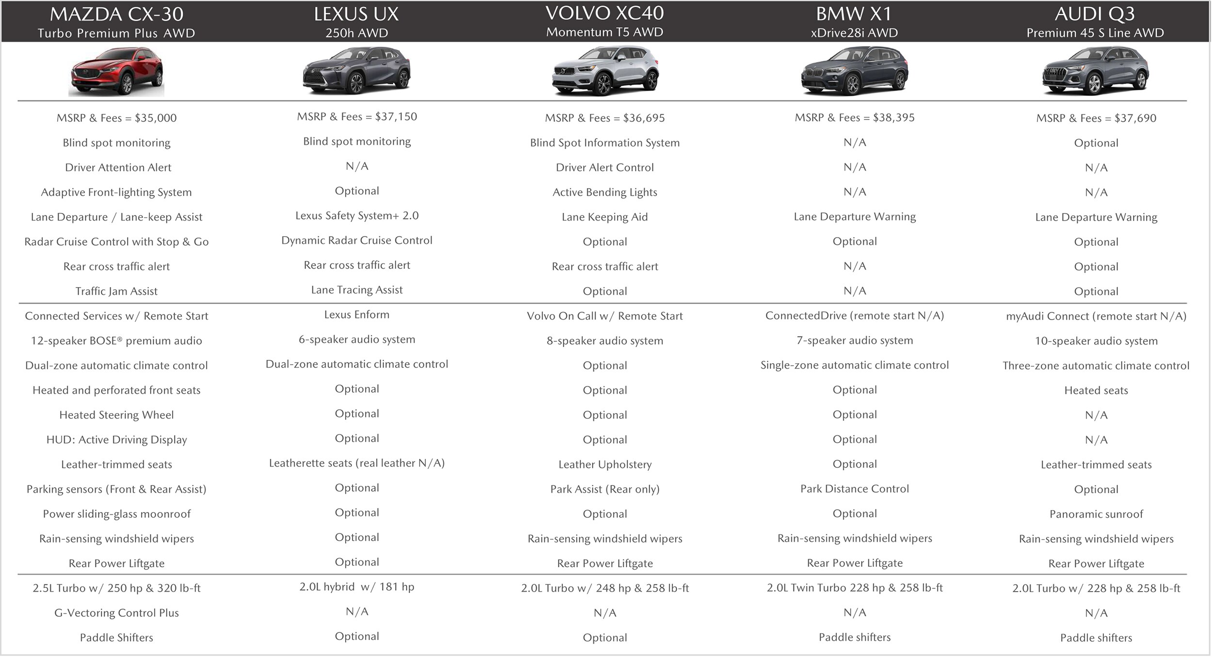 Many standard features on the Turbo Premium Plus are up-sells for our competitors. A customer would have to spend an average of $43,089 to purchase a "premium" competitor that is comparably equipped to the CX-30 Turbo Premium Plus AWD, which costs about $8,000 less. The CX-30 offers an interior quality that is 2nd only to Lexus in quietness and NVH.