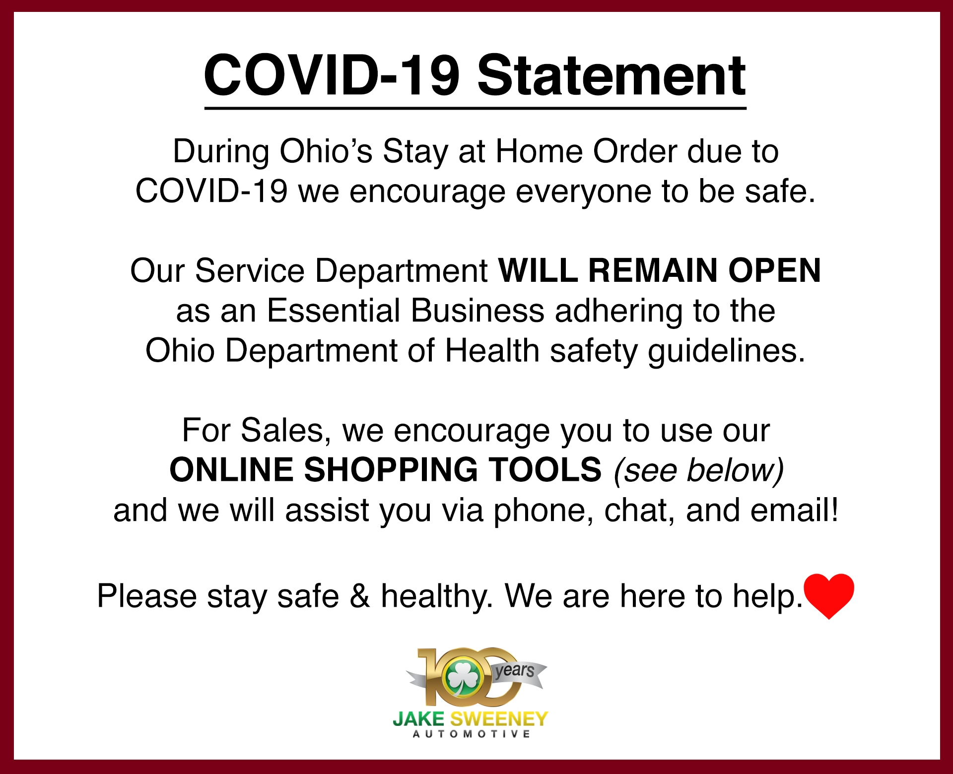 We know that these are challenging times, and your vehicle should be the least of your worries. That's why Jake Sweeney Mazda West is here and committed to helping you in any way we can - from answering your questions to servicing your vehicle and everything in-between. Because in times like these, we're faced with many uncertainties. If you would like to read our COVID-19 company statement, you can do so here.